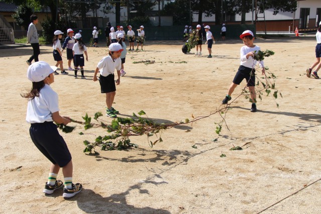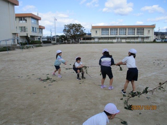 生活科の学習で、さつまいものつるを使った遊びを行いました。子どもたちは、長いつるで大縄跳びをしたり、つるを引っ張りあったりしながら、友達と一緒に楽しんでいました。つるを使って、リースを作ったり、体に巻き付けて衣装のようにまとったりして遊ぶ子もいました。