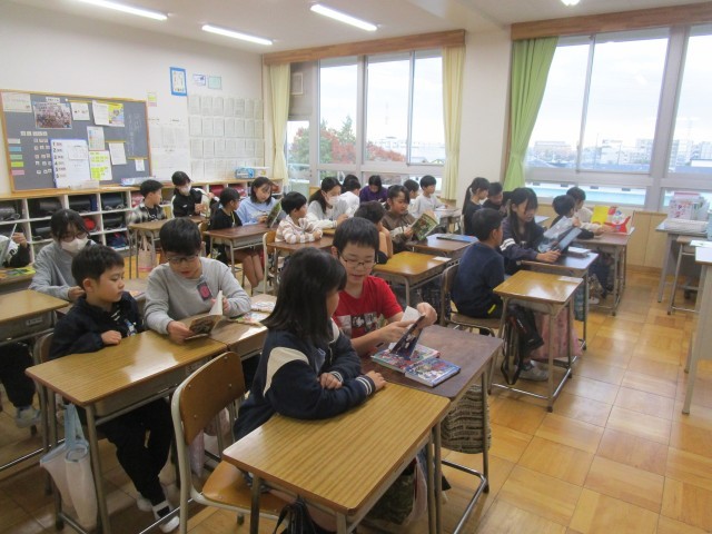 11月4日から14日までの「もみじ読書週間」の取り組みとして、ペア読書がありました。5年生のペアの子に絵本をよんでもらいました。この日のために3年生が喜ぶ本を選び、練習してもらったのだと思います。時間がたっぷりとあったので、本を交換したり、感想を伝え合ったりして楽しく過ごすことができました。