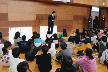 二つ目は、体育館に設置された新しい演台についてです。西小学校50周年の節目に、PTAの皆様から寄付をいただきました。これから、60周年、70周年、さらには100周年に向けて、大切に使っていきます。