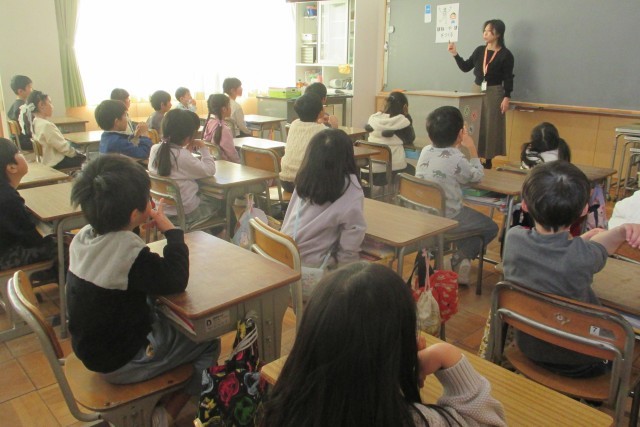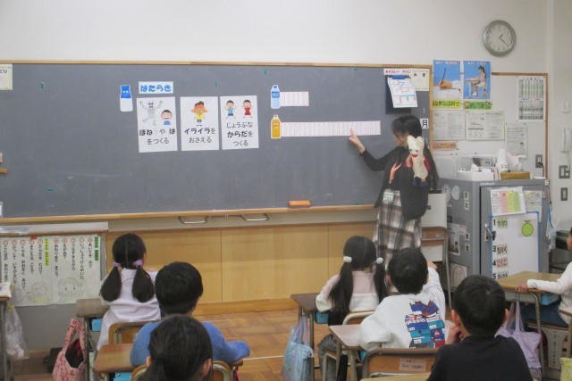 栄養教諭の前田先生から「カルシウムの大切さ」について教えていただきました。給食中に飲む牛乳には「骨や歯を作る」「イライラを抑える」「じょうぶな体を作る」という働きがあることを話していただき、他の飲料と比べてカルシウムが多いことを「カルちゃん人形」を用いて、分かりやすく教えていただきました。