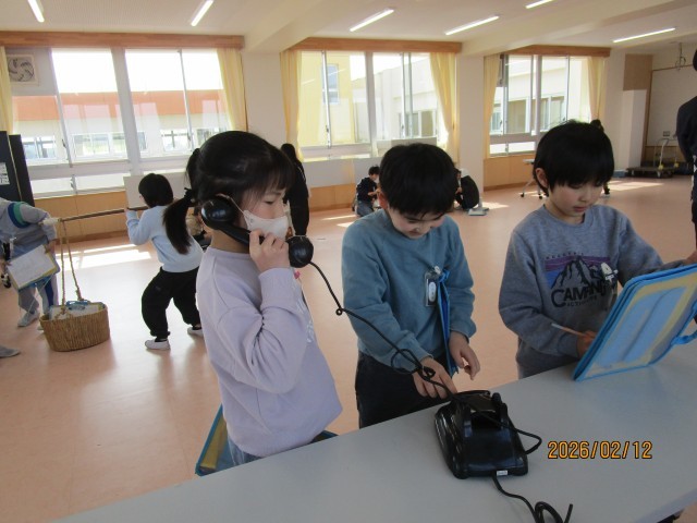 大口町の歴史民俗資料館から講師に来ていただき、昔の道具について学習しました。アイロン(火のし、炭火アイロン、電気アイロン)、洗濯機(せんたく板、たらい、手回しせんたくき)、羽釜(かまどの模型付き)、もっこ(+天びんぼう)、黒電話、わらじ、みの、ランプ、ちょうちん、蓄音機を実際に持ってきていただきました。初めに、使い方や、注意点の説明を聞きました。その後、体験したり、見学したりして分かったことをメモしました。特に、蓄音機で実際にレコードの曲を聴かせてもらい、レトロな雰囲気を味わうこともしました。子どもたちにとって、初めて見るものがほとんどだったようです。ご家庭でもぜひどんな様子だったか聞いてみてください。