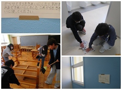 図工室の机の脚についたゴミをとる様子とトイレの床をピカピカにしている様子です。