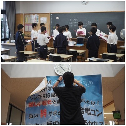 今回の掲示物はあえての「真の絆が試される合唱コン、さぁ、歴史を作れるかな?」という問いかけです。本番当日に答え合わせをしましょうね♪