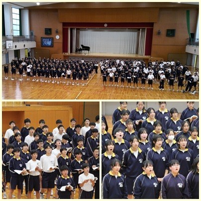 合唱コンクール本番まで残り13日ということで、今日は本番の並び方に近い形で練習を進めました。歌い始めのブレスや最後のロングトーンなど、パートリーダーの指示に従って練習を進める中で、少しずつ合唱がよくなっていきました。毎回の学年合唱練習はパートリーダーたちが、どうしたらよりよい合唱になるか、たくさん考え、練習内容を決めています。頑張る人の想いに応えられる、そんな学年でありたいですね。
