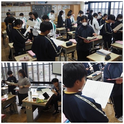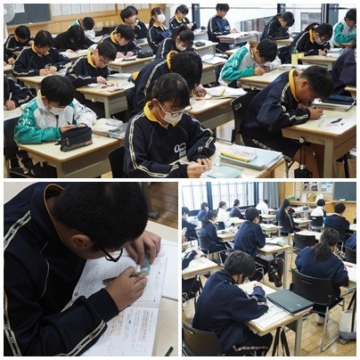 授業に入っている学級にはテスト返しの時に話題にしましたが、3学期には「実力」テストが1日日程で実施されます。定期テストとは違い、範囲が広いです。実力テストから自分の今の力を知り、「感」じたことから「動」くことが「未来」につながっていきますからね!