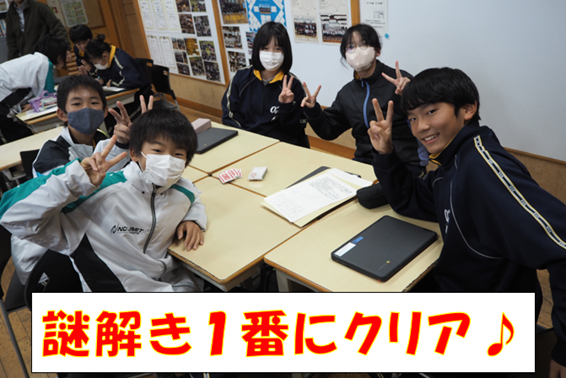謎解きクリアした班の皆さん、本当におめでとう!!!!!1番にクリアした学級の班の写真を1枚目に載せておきますね!「すごい!!」