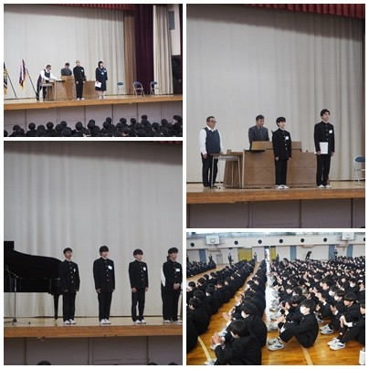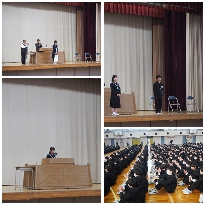表彰伝達の後は終業式が行われましたね。校長先生の式辞の後には各学年の代表生徒による振り返りを行ってもらいました。全校生徒の前で話すのはとっても緊張したかと思うけど、立派に振り返りを伝えることができました!本当にがんばったね♪