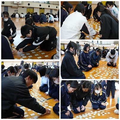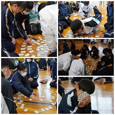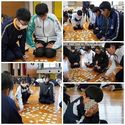 3学期が始まって新年にふさわしい行事を行いたいと思い、百人一首大会が行われました。今回の大会開催にあたって国語科であるN先生やK先生を中心にいろいろと準備をしてくれました。本当に感謝です!「こういうことがやりたい!」と言ったときにTEAMでなんでも動いてくださる1年生学年スタッフ集団はとってもすごいんです!!!!!