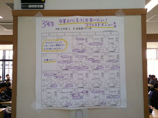 フロアには卒業までもう1度食べたいリクエストメニューが掲示されています。本日のリクエストメニューは、ハンバーグのきのこあんかけ、スタミナ汁、じゃこキャベツでした。ちなみに土川先生のリクエストメニューは肉じゃが、渡邉先生は1個の大きい唐揚げ、石山先生は厚焼き玉子らしいです。卒業まで36日です。給食を食べられる回数も少なくなってきました。1回1回の給食を感謝の気持ちをもっていただきましょう。