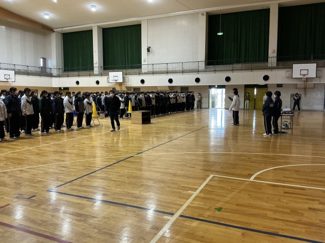 リーダーの生徒が前に立ち、学年全員に説明する姿