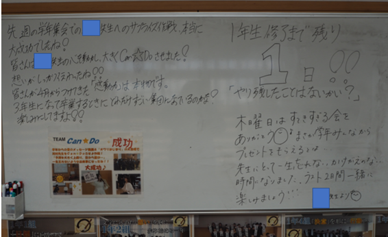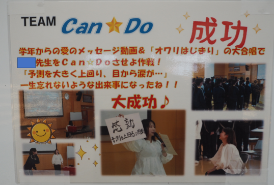 先週の学年集会のサプライズ作戦は本当に素敵な時間となりましたね。学年フロアのホワイトボード掲示板には「K先生をCan☆Doさせよ作戦」の掲示物を貼っておきました。