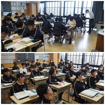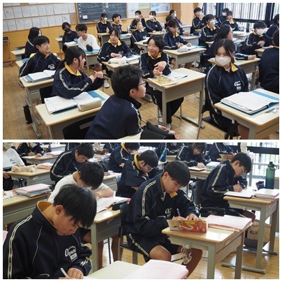 空き時間に学年フロアを見て回りました。どの学級も本当に一生懸命に学習に取り組んでいます。1年後を考えると中2のこの1年間の取り組み方は本当に重要です。今週配付予定の学年通信にも似たようなことを話題にしているのでしっかりと読んでくださいね♪