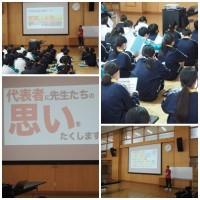 さらに、今夜から自学の取り組み方も変わります。プリントを配付してあると思いますのでそれに沿って取り組みましょう。慣れないうちは、戸惑ったり大変なこともあったりすると思います。けれど、大中1年生が今よりもっと進化するために先生たちが一生懸命考えた方法の一部です。前向きに取り組んでください。しばらくしたら、結果を見て、それを受けて改善し、より良いものを創る。先生たちもみんなと同じです。大中1年生が今よりもっと進化するためにみんなと先生たちで共に考え、悩み、取り組んでいきましょう。