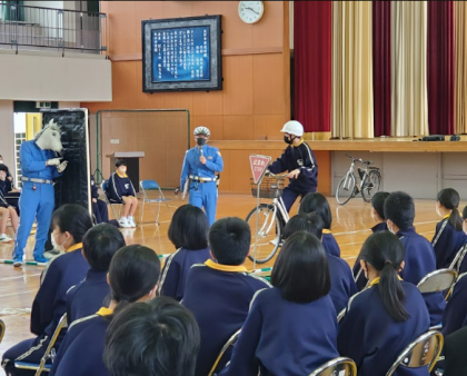 今日は交通安全教室がありました。江南警察署からB-Forceの方々に来ていただき、自転車に関する講話を受けました。自転車の危険性や、ヘルメットの重要性を実演を交えながら教わりました。無事故無違反で一年間を過ごし、安全な生活を送りましょう。